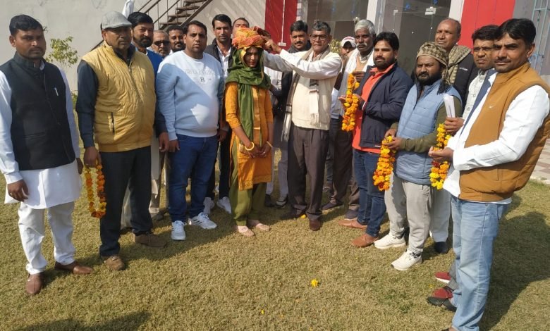 फोटो कैप्शन-सर्व सहमति से प्रधान बनी सुमन देवी को पगड़ी पहनाकर सम्मानित करते हुए सीहमा ब्लॉक के सरपंच।