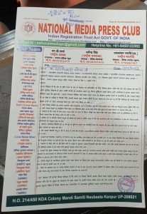 आपको बता दे पत्रकार हितों पर निरंतर कार्य कर रहा राष्ट्रीय संगठन नेशनल मीडिया प्रेस क्लब द्वारा आज कानपुर जिलाधिकारी कार्यालय पहुंचकर जिलाधिकारी ACM के माध्यम से माननीय प्रधानमन्त्री व महामहिम राष्ट्रपति महोदया, माननीय मुख्यमंत्री व माननीय राज्यपाल महोदय को संबोधित पत्रकार हितों के लिए 11 सूत्रीय मांग पत्र भेजा, पत्रकार देश व समाज का एक ऐसा सामाजिक योद्धा है जो समाज के हर पहलू को अपना समझकर निश्वार्थ भाव से करता है लेकिन सरकार पत्रकारों की ओर ध्यान नहीं दे रही है आज़ पत्रकार की कलम को बरकरार रखने हेतु निम्न सुविधाएं प्रदान करना अति आवश्यक है आज नेशनल मीडिया प्रेस क्लब द्वारा 11 सूत्रीय निम्न मांग पत्र को सरकार को ध्यान आकर्षित करने हेतु संगठन द्वारा भेजा गया है जो इस प्रकार है ।