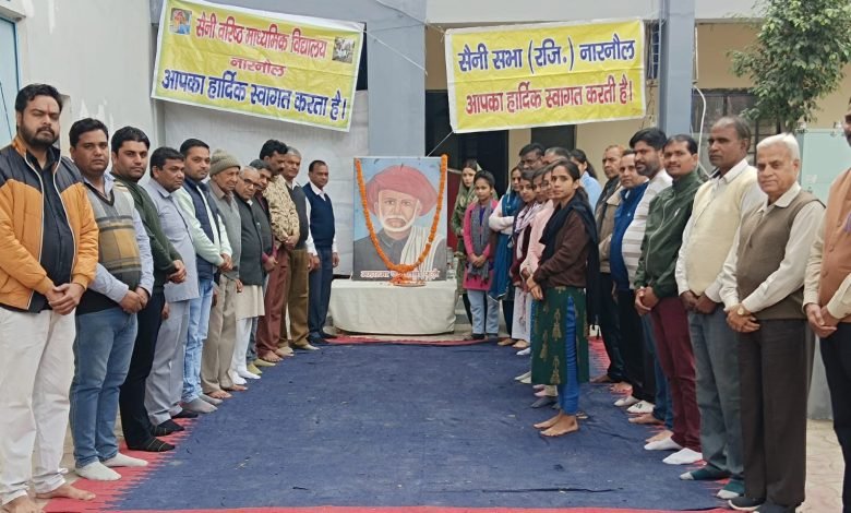 स्थानीय सैनी सभा नारनौल द्वारा संचालित सैनी वरिष्ठ माध्यमिक विद्यालय रेवाड़ी रोड मे मंगलवार को महान समाज सुधारक, शिक्षा के अग्रदूत महात्मा ज्योतिबा फुले की 133वीं पुण्यतिथि मनाई गयी। सर्वप्रथम सभा प्रधान एवं समस्त पदाधिकारी एवं समाज के गणमान्य व्यक्तियों, विद्यालय स्टाॅफ द्वारा ज्योतिबा फुले के चित्र पर पुष्प अर्पित कर उनको नमन करते हुए कार्यक्रम की शुरुआत की।