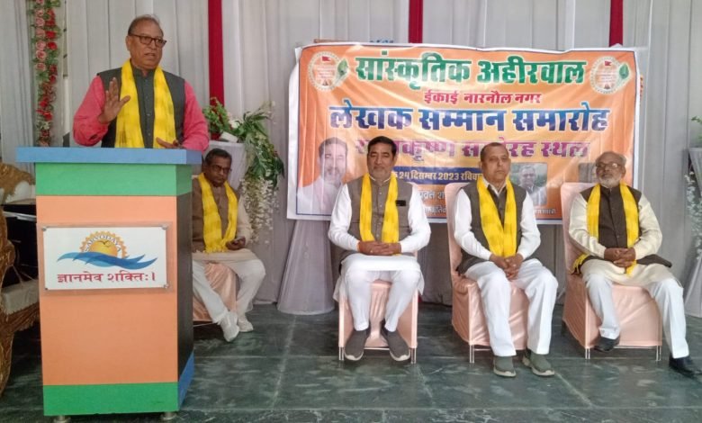 सांस्कृतिक अहीरवाल संस्था ने नारनौल नगर के ऐतिहासिक इतिहास लेखन हेतु सहयोग करने वाले लोगों का सम्मान समारोह का आयोजन नारनौल के राधाकृष्ण समारोह स्थल में आयोजित किया।जिसकी अध्यक्षता दलजीत शास्त्री ने की । कार्यक्रम का आरम्भ दीप प्रज्वलन के साथ किया गया । कार्यक्रम में मुख्य वक्ता के रूप में सम्बोधित करते सांस्कृतिक अहीरवाल संस्था के निदेशक सत्यव्रत शास्त्री ने कहा भारत में सांस्कृतिक विरासत का संरक्षण करने की पुरातन परम्परा है। महाभारत काल से आरंभ हुई अहीरवाल संस्कृति एक समृद्ध संस्कृति रही है ।इस क्षेत्र में पाण्डवों के वनवास काल के अनेक प्रसंग तथा ऐतिहासिक इमारतें हैं जिनसे इस क्षेत्र की ऐतिहासिकता का बोध होता है।अहीरवाल की समृद्ध परम्परा में वीरता , विद्वता और ऐतिहासिकता का विशाल भंडार है उन्होंने नारनौल नगर के सभी प्रबुद्ध लोगों को आह्वान किया कि अभी लेखन कार्य शुरु हुआ हमें गम्भीरता से लोगों से सम्पर्क कर अपने पूर्वजों के किये त्याग तपस्या और साधना का रिकार्ड एकत्र करना है।इसकी प्रमाणिकता पर कोई संदेह नहीं रहना चाहिए। सत्यव्रत शास्त्री ने कहा कि आज हमारी प्राथमिकता को जनता तथा वैचारिक लोग स्वीकार करने लगे हैं।गत दिनों राजस्थान के विधानसभा चुनाव की समीक्षा में राष्ट्रीय चैनलों ने अहीरवाल क्षेत्र को पहली बार अलग से उल्लेखित किया है इसके लिए सत्यव्रत शास्त्री ने सभी प्रकार के मीडिया हाउसों का धन्यवाद किया ।आज के कार्यक्रम का मंच संचालन राजेश शास्त्री ने किया।सभी उपस्थित लोगों का स्वागत और धन्यवाद नगर संयोजक रामसि़ह मधुर ने किया।नगर के लोगों के अलावा नांगल चौधरी ईकाई के संयोजक ओमप्रकाश रावत ,सिहमा ईकाई के डा राजपाल व ओमप्रकाश खनगवाल,नारनौल ईकाई के सत्यवीर यादव ओमप्रकाश यादव व राजकुमार यादव मीडिया प्रभारी शीशपाल यादव कोषाध्यक्ष राजवीर यादव उपस्थित रहे।