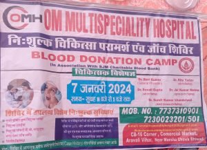 भिवाड़ी ओम मल्टी स्पेशलिटी हॉस्पिटल द्वारा निशुल्क चिकित्सा परामर्श एवं जाच शिविर व ब्लड डोनेशन कैंप का आयोजन