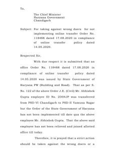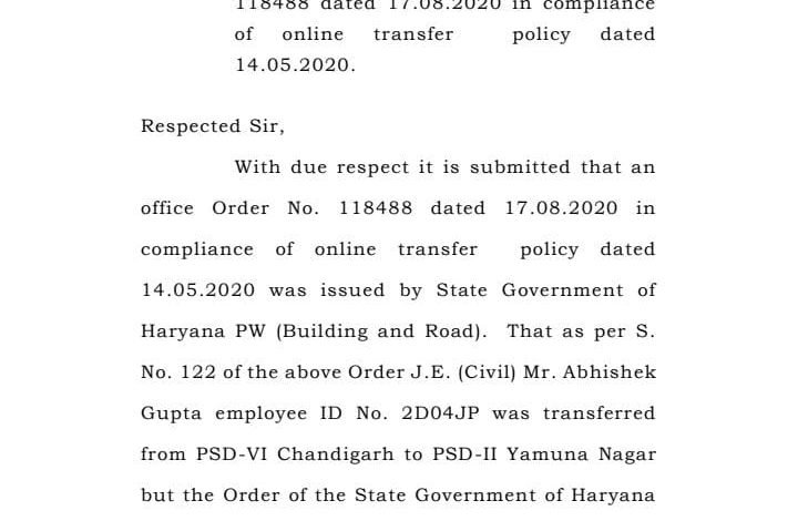 ऑनलाइन ट्रांसफर पॉलिसी के अनुसार हरियाणा के लोक निर्माण विभाग के जेई अभिषेक गुप्ता के साथ-साथ कुछ अन्य विभागो के जेई का भी 17 अगस्त 2020 को ट्रांसफर किया गया। विभाग ने अपने हितों को साधते हुए अभिषेक गुप्ता को पहले के स्थान पर ही रखा। इसी के साथ-साथ 2023 तक ना तो अभिषेक गुप्ता को ट्रांसफर आदेश 17 अगस्त 2020 के आधार पर पीएसडी सेकंड यमुनानगर भेजा गया। इतना ही नहीं शिकायत करने पर भी विभाग ने को कोई कार्रवाई नहीं की जबकि ऑनलाइन ट्रांसफर पॉलिसी के हिसाब से मुख्यमंत्री के पास ऐसा कोई अधिकार नहीं है और ना ही अभिषेक गुप्ता द्वारा दिए गए प्रतिरूप पर ऐसी टिप्पणी की गई। सिर्फ विभाग में उन्हें संबंध में विभाग अधिकारियों के आधार पर विभाग ने अपने हित साधते हुए ऑनलाइन ट्रांसफर पॉलिसी की 3 साल तक धज्जियां भी उड़ाई है। इसी के साथ-साथ आपको बता दे की शिकायत मुख्यमंत्री के शिकायत निवारण पोर्टल पर 17 अगस्त 2023 से जस की तस की पड़ी हुई है।