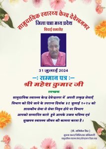 सामुदायिक स्वास्थ्य केंद्र देवेंद्रनगर से महेश कुमार बाल्मिक हुए सेवानिवृत कि गई आत्मीय बिदाई