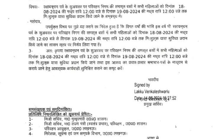 परिवहन निगम मुख्यालय से अपर प्रबंध निदेशक राम सिंह वर्मा ने रक्षाबंधन पर्व पर 19 व 20 अगस्त को महिला यात्रियों को मुफ्त यात्रा कराने के निर्देश दिए हैं। मुख्य पर्व और समापन के बाद बढ़ने वाली भीड़ को देखते हुए अतिरिक्त बसों की सुविधा उपलब्ध कराने के लिए डिपो के एआरएम व क्षेत्र के आरएम को निर्देशित किया है। डिपो के बेड़े की शत-प्रतिशत बसों को दुरुस्त कर ऑन रोड करने को कहा गया है। सभी डिपो लखनऊ व कानपुर तक अनुबंधित के अलावा निगम की बसों का संचालन करेंगे।