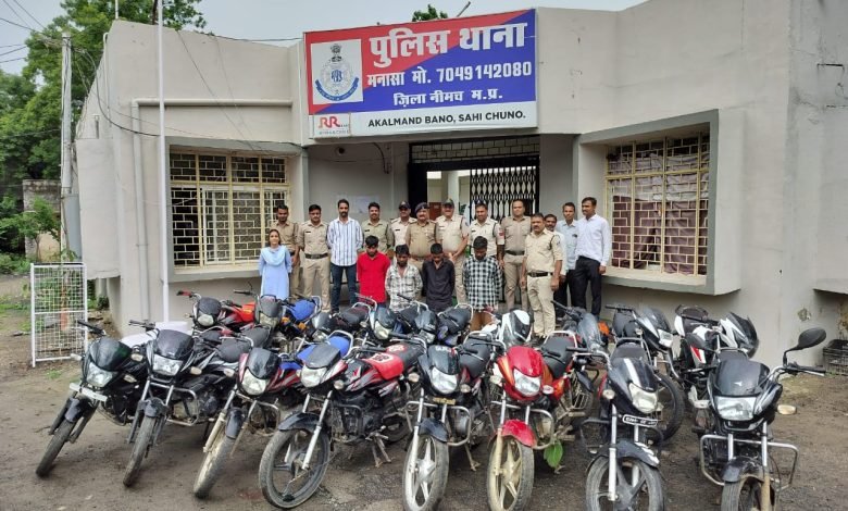 एसपी महोदय नीमच श्री अंकित जायसवाल के निर्देशन में एवं एडिशनल एसपी महोदय नीमच श्री नवल सिंह सिसोदिया एवं अनुविभागीय अधिकारी पुलिस मनासा श्री विमलेश उइके के मार्गदर्शन एवं थाना प्रभारी मनासा निरीक्षक शिवकुमार यादव के कुशल नेतृत्व में मनासा पुलिस टीम द्वारा अंतराज्यिय वाहन चोर गिरोह का पर्दाफाश करते हुए अलग-अलग स्थान से चुराई गई 18 मोटरसाइकिलों को जप्त किया जाकर वाहन चोर गिरोह को गिरफ्तार करने में सफलता हासिल की जिले में लगातार हो रही चोरी पर अंकुश लगाने एवं अपराधों को संज्ञान में लेकर अभियान के तहत संपत्ति संबंधित अपराधों में पतारसी करने हेतु समस्त अनुविभागीय अधिकारी एवं थाना प्रभारी को अपना सूचना तंत्र मजबूत करने वह अपराधियों की तलाश कर घटनाओं के तह तक पहुंचकर घटनाओं में की गई संपत्ति की बरामदगी की वह अपराधियों को गिरफ्तार करने हेतु आदेशित किया गया था। उपरोक्त संपत्ति संबंधित अपराधों के घटनास्थल की आधार पर शहर व मुख्य मार्गों पर ऑपरेशन नीमच आई के तहत लगाए गए सीसीटीवी कैमरे की मदद से आरोपियों के फुटेज आदि लिए गए तथा घटना में संभावित स्थानों पर सूचना तंत्र लगाकर सिविल में पुलिस की मॉनीटरिंग कर आरोपियों की तलाश की गई पुलिस के द्वारा अपनी व्यावसायिक दक्षता तकनीकी साक्ष की मदद से कस्बा मनासा में हो रही वाहन चोरी की घटनाओं में आरोपियों की पहचान स्थापित कर आरोपियों से पूछताछ की गई पूछताछ में आरोपियों ने नीमच सरवानिया मनासा मंदसौर पिपलिया मंडी व रतलाम तथा पड़ोसी राज्य राजस्थान के निंबाहेड़ा बेगु जोगणिया माता चित्तौड़गढ़ आदि स्थानों पर वाहन चोरी की वारदात को कबूला तथा आरोपियों के कब्जे से 18 मोटर साइकिले जप्त कर चार आरोपियों को गिरफ्तार किया वह दो अन्य फरार आरोपियों की तलाश जारी कार्रवाई के दौरान पुलिस ने 18 बाइक जप्त की है।