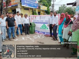 खैरथल-तिजारा 17 सितम्बर। जिला कलेक्टर किशोर कुमार ने खैरथल-तिजारा में अंबेडकर चौराहा पर श्रमदान कर प्रदेश में ‘स्वच्छता ही सेवा’ अभियान की शुरूआत की। इस अवसर पर जिला कलेक्टर ने आमजन को जिम्मेदार नागरिक का कर्तव्य निभाते हुए शहर को स्वच्छ एवं सुंदर बनाने के लिए स्वच्छता की शपथ भी दिलाई।