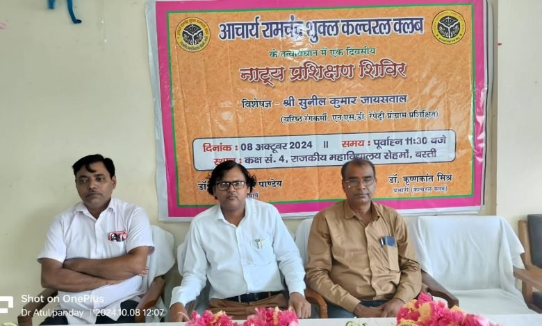रंगमंच का प्रारंभ मानव सभ्यता के विकास के साथ हो गया था यह मानव की मूल क्रिया है और विश्व की सभी सभ्यताओं में इसकी स्वीकार्यता है। रंगमंच से व्यक्ति की अंतर्निहित क्षमता का विकास होता है तथा सामूहिकता की भावना बलवती होती है। राजकीय महाविद्यालय सेहमो बस्ती में एक दिवसीय नाट्य प्रशिक्षण शिविर में मुख्य वक्ता और प्रशिक्षक के रूप में आमन्त्रित सुनील जायसवाल ने यह उद्बोधन प्रशिक्षण शिविर का प्रारम्भ करते हुए कहा। आचार्य रामचंद्र शुक्ल कल्चरल क्लब के तत्वावधान में आयोजित इस कार्यक्रम की शुरुआत सरस्वती प्रतिमा पर माल्यार्पण और दीप प्रज्ज्वलित करके किया गया। स्वागत गीत बी ए तृतीय वर्ष की छात्रा प्रीति ने गाया। मीनाक्षी द्वारा सांस्कृतिक नृत्य प्रस्तुत किया गया।इस अवसर पर आयोजित लोकगीतों की प्रतियोगिता में रोशनी,आराधना और प्रीति ने क्रमशः प्रथम, द्वितीय और तृतीय स्थान प्राप्त किया। रंगमंच प्रशिक्षण के अंतर्गत प्रतिभागियों को संवाद,अभिनय, मेकअप, हाव-भाव और समन्वय के विषय में विस्तार से बताया गया। कार्यक्रम की अध्यक्षता के प्राचार्य डॉ अतुल कुमार पाण्डेय ने किया।अतिथि के लिए स्वागत वक्तव्य श्री शैलेन्द्र कुमार तथा धन्यवाद ज्ञापन डॉ श्याम मनोहर पाण्डेय द्वारा दिया गया।इस अवसर पर छात्र छात्राओं के अतिरिक्त डॉ रिजवान अहमद, डॉ प्रीति वर्मा,मोहित सोनी, परमानंद सिंह, विजय मिश्र, विनीत सिंह, कमलेश कुमार और वीरेंद्र कुमार उपस्थित थे। कार्यक्रम का संचालन डॉ आनन्द कुमार पाण्डेय ने किया।