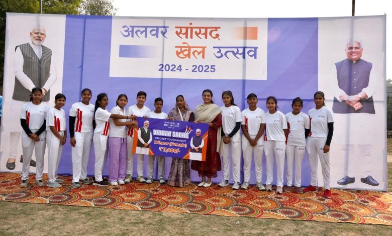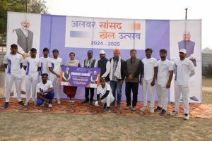 भिवाड़ी. वी-शक्ति के बैनर के अंतर्गत अलवर सांसद और केंद्रीय वन एवं पर्यावरण मंत्री भूपेंद्र यादव द्वारा प्रधानमंत्री नरेंद्र मोदी के विजन ‘खेलो इंडिया’ की प्रेरणा से अलवर संसदीय क्षेत्र में आयोजित हो रहे अलवर सांसद खेल उत्सव के अंतर्गत आज राज ऋषि कॉलेज के खेल मैदान में क्वार्टर फाइनल मैच का पहला मुकाबला महिला टीम राजगढ़ और रामगढ़ के बीच हुआ। राजगढ़ टीम ने टॉस जीतकर गेंदबाजी करने का निर्णय लिया। रामगढ़ टीम ने पहले बल्लेबाजी करते हुए सात ओवर में अपने 4 विकेट खोकर 54 रन बनाए। जवाब में, राजगढ़ टीम ने जबरदस्त बल्लेबाजी करते हुए एक विकेट गंवाकर लक्ष्य हासिल किया और जीत दर्ज की। इस मुकाबले में बेहतरीन बल्लेबाजी और गेंदबाजी के लिए सपना को ‘मैन ऑफ द मैच’ घोषित किया गया।