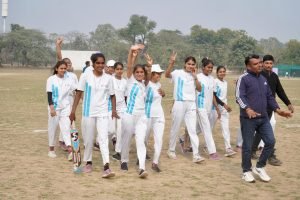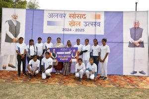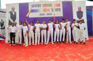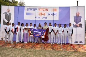 भिवाड़ी. वी-शक्ति के बैनर के अंतर्गत अलवर सांसद और केंद्रीय वन एवं पर्यावरण मंत्री भूपेंद्र यादव द्वारा प्रधानमंत्री नरेंद्र मोदी के विजन ‘खेलो इंडिया’ की प्रेरणा से अलवर संसदीय क्षेत्र में आयोजित हो रहे अलवर सांसद खेल उत्सव के अंतर्गत आज राज ऋषि कॉलेज के खेल मैदान में क्वार्टर फाइनल मैच का पहला मुकाबला महिला टीम राजगढ़ और रामगढ़ के बीच हुआ। राजगढ़ टीम ने टॉस जीतकर गेंदबाजी करने का निर्णय लिया। रामगढ़ टीम ने पहले बल्लेबाजी करते हुए सात ओवर में अपने 4 विकेट खोकर 54 रन बनाए। जवाब में, राजगढ़ टीम ने जबरदस्त बल्लेबाजी करते हुए एक विकेट गंवाकर लक्ष्य हासिल किया और जीत दर्ज की। इस मुकाबले में बेहतरीन बल्लेबाजी और गेंदबाजी के लिए सपना को ‘मैन ऑफ द मैच’ घोषित किया गया।