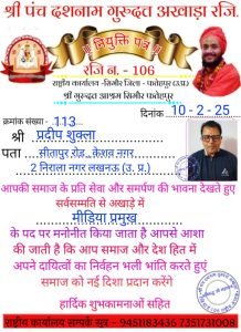 देशवासियों एवं प्रदेशवासियों और विदेश वासियों के लिए बहुत बड़ी खबर श्री पंच दशनाम गुरुदत्त अखाड़ा रजि. के राष्ट्रीय अध्यक्ष संत शिरोमणि अनिरुद्ध जी महाराज ने स्वतंत्र पत्रकार प्रदीप शुक्ल को मीडिया प्रमुख के पद पर मनोनीत किया है, आप समस्त देशवासियों एवं प्रदेशवासियों और विदेश वासियों को अवगत कराते हुए बड़ा ही हर्ष का अनुभव कर रहा हूं जो एक महत्वपूर्ण और पवित्र कदम है। यह मनोनयन न केवल प्रदीप शुक्ल के लिए बल्कि पत्रकारिता के क्षेत्र में भी एक नए युग की शुरुआत का प्रतीक है