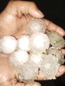 टपूकड़ा. तहसील क्षेत्र में तेज हवाओं व बादलों की गर्जना के साथ बेर के आकार के ओले पड़े शुक्रवार को पूरे दिन क्षेत्र में बादलों की आवा जाई लगी रही प्रात: करीब 10:00 बजे हल्की बूंदाबांदी भी हुई दोपहर बाद हल्की धूप भी निकली तो लोगों ने राहत की सांस ली लेकिन देर शाम करीब 8:00 बजे अचानक तेज हवा चलने लगी और गर्जना के साथ मोटे-मोटे ओले गिरने लगे लोगों ने बताया कि इससे फसलों में नुकसान होने की संभावना है हवा और ओलों की वजह से पेड़ों के पत्ते भी टूट कर गिरने लगे हल्की बरसात के साथ करीब 3 से 5 मिनट तक ओले पड़े।