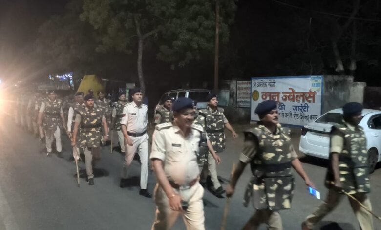 आने वाले त्योहारों को देखते हुए देवेंद्रनगर में एसडीओपी एस पी सिंह बघेल के नेतृत्व में निकाला गया पैदल फ्लैग मार्च