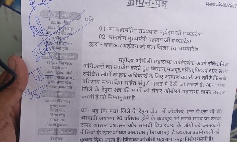 पन्ना जिला के रैपुरा क्षेत्र में ओ बी सी/ एस टी एस सी की आबादी 90% होने के बावजूद भी शासन एवं सामंती लोगों की दमनकारी नीतियों के द्वारा शोषण अत्याचार होता आ रहा है जो आवाज उठाने पर उनकी आवाज को कुचल दिया जाता है जिसका ओबीसी महासभा विरोध करती है सरकार यह जानते हुए कि शराब के नशा करने से हर वर्ष कितने हादसा होते हैं फिर भी शासन जगह-जगह शराब के ठेके खुला रही है और शासन के जिम्मेदार यह बताते हैं कि शासन की सभी योजना इसी से संचालित हो रही है बिगत दिनो बघबारकला में भी शराब की दुकान खोली गई जिसका ग्राम वासियों ने कड़ा विरोध किया इसके बाद भी दुकान खोली गयी जनता में आक्रोश का माहौल व्याप्त है ओबीसी महासभा चाहती है जबकि इसका जीता जगता उदाहरण गुजरात, बिहार जहां पूर्ण रूप से शराब बंदी है तो क्या देश कि योजना बंद हो गई, ओ वी सी महासभा का सरकार से सिर्फ इतना कहना है कि अपनी नीतियां सुधार ले जनहित को ध्यान में रखते हुए इस प्रकार से शराब की दुकाने ना खोलें इसी कड़ी में विगत दिनों नीरज लोधी बड़ागांव निवासी गाडरी के राजस्व के जमीन के मेटर को लेकर रैपुरा थाने गऐ थे थाना प्रांगण में मौजूद राजेश मरावी आरक्षक के द्वारा कहा सुनी हुई और यह भी बताया गया की मारपीट भी हुई।नीरज लोधी के ऊपर सरकारी कार्य में बाधा उत्पन्न करने पर एफ, आई,आर हुई एबं जेल भेजा गया था इसी का विरोध करने के लिए सैकडो की तादात में आज महासभा के कार्यकर्ता एवं पदाधिकारी गण अवंती चौक से एक विशाल जुलूस निकाला जिसमें यह कहा की एफ,आई,आर करने वाले अधिकारी को पद से बर्खास्त किया जाऐ और यह भी कहा की सात दिन के अंदर यदि नीरज के ऊपर जो फर्जी तरीके से एफ आई आर की गई है वह वापस नहीं ली तो हम बड़े स्तर पर एक विशालआंदोलन करेंगे जिसकी शासन प्रशासन की जवाबदारी होगी।