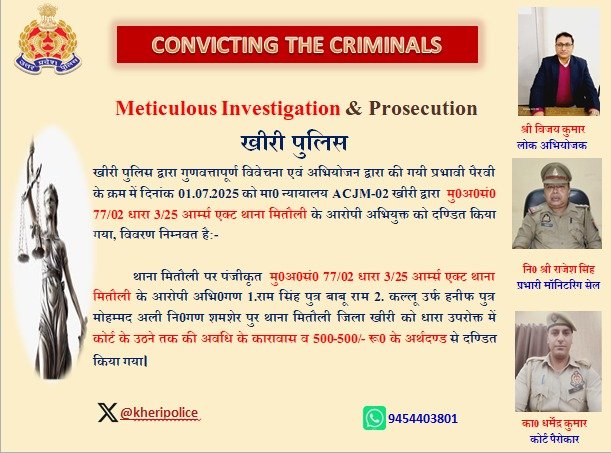 खीरी पुलिस की इस कार्रवाई से यह स्पष्ट होता है कि जनपद पुलिस अपराधियों को सजा दिलवाने के लिए गंभीरता से कार्य कर रही है तथा ऑपरेशन कन्विक्शन के तहत न्याय दिलाने की दिशा में निरंतर प्रयासरत है।