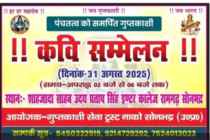 गुप्तकाशी सेवा ट्रस्ट नाको सोनभद्र के संयोजक/ कार्यक्रम आयोजक रवि प्रकाश चौबे ने बताया कि 31 अगस्त रविवार को दोपहर बाद दो बजे से छ बजे शाम तक शाहजादा साहब उदय प्रताप सिंह इंटर कालेज रामगढ़ में कवि सम्मेलन का आयोजन किया गया है। कवि सम्मेलन की