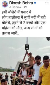 लूणी नदी मे आज सवारी सहित एक बोलेरो गाड़ी के डूबने का अत्यंत दुखद समाचार प्राप्त हुआ। प्रारंभिक जानकारी अनुसार कुछ लोगों की मृत्यु की खबर सामने आई है, वहीं अन्य की तलाश हेतु रेस्क्यू कार्य जारी है। विधायक् ने