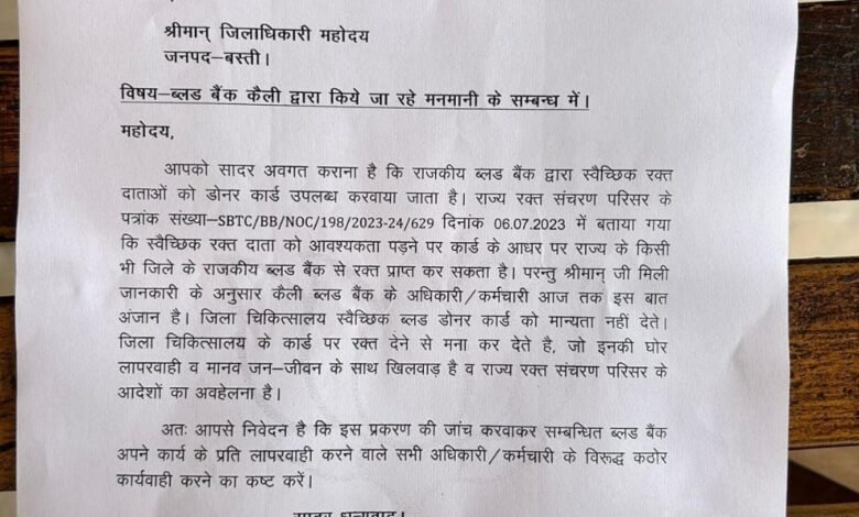 बस्ती, 23 सितम्बर। भाजयुमो नेताओं ने जिलाधिकारी को शिकायती पत्र देकर राजकीय ब्लड बैंक के कर्मचारियों पर मनमानी का आरोप लगाया है। शिकायतकर्ता भाजयुमो जिला मंत्री प्रदीप चौधरी ने बताया कि यहां से स्वैच्छिक रक्त दाताओं को डोनर कार्ड उपलब्ध करवाया जाता है। राज्य रक्त संचरण परिसर के पत्रांक संख्या सबीटीसी/बीबी/एनओसी/198/2023-24/629 में बताया गया कि स्वैच्छिक रक्त दाता आवश्यकता पड़ने पर कार्ड के आधार पर राज्य के किसी भी जिले के राजकीय ब्लड बैंक से रक्त प्राप्त कर सकता है।