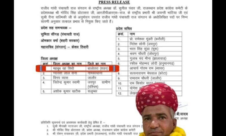 हबूब खां सिंधी बने राजीव गांधी पंचायती राज संगठन के बालोतरा जिला अध्यक्ष