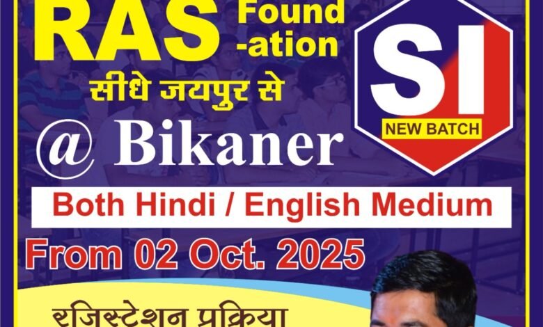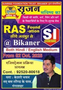 SUNRISE FOUNDATION TRUST, BIKANER द्वारा संचालित *सृजन भविष्य का* संस्थान में RAS और SI के लिए नया बैच 2 अक्टूबर से शुरू हो रहा है, और यह आपके लिए सुनहरा अवसर है! इस बैच में जयपुर और दिल्ली की अनुभवी और श्रेष्ठ फैकल्टी आपकी तैयारी को नई ऊंचाइयों तक ले जाने में मदद करेंगी।