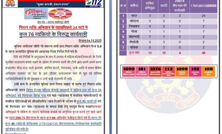 जनपद खीरी में मिशन शक्ति अभियान 5.0 के तहत पिछले 24 घंटे में खीरी पुलिस द्वारा कुल 76 व्यक्तियों के विरुद्ध कार्यवाही की गई