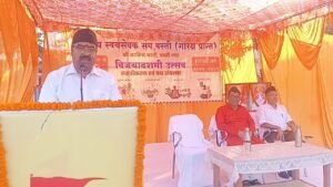 मुख्य वक्ता श्री मिथिलेश जी ने अपने प्रेरणादायी उद्बोधन में संघ के “पाँच परिवर्तनों” का उल्लेख करते हुए विजयादशमी उत्सव के महत्व पर प्रकाश डाला और संघ की कार्य विस्तार यात्रा का विस्तृत वर्णन प्रस्तुत किया। उन्होंने कहा कि राष्ट्रीय स्वयंसेवक संघ का शताब्दी वर्ष राष्ट्र निर्माण, सेवा और संगठन की सदी भर की प्रेरक यात्रा का प्रतीक है। यह वर्ष “एक भारत, श्रेष्ठ भारत” के संकल्प को साकार करने का समय है, जहाँ समाज, संस्कृति और संस्कार एक सूत्र में पिरोए जा रहे हैं। यह केवल उत्सव नहीं, बल्कि आत्मनिर्भर और संगठित भारत के निर्माण का संकल्प है।