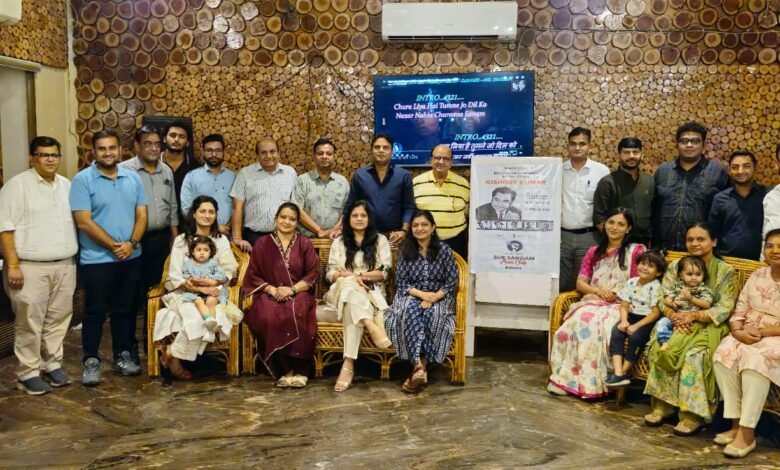 बालोतरा, सुर संगम संगीत क्लब द्वारा सुर सम्राट किशोर कुमार की 38वीं पुण्यतिथि के अवसर पर विशेष कार्यक्रम का आयोजन किया गया। क्लब अध्यक्ष कैलाश गर्ग ने बताया कि इस भव्य कार्यक्रम का आयोजन क्लब नरेशा नाकोड़ा रोड पर किया गया। विशेष अतिथि के तौर पर न्यायाधीश सिद्धार्थ दीप व दीपक तंवर (आर.ओ)को आमंत्रित किया गया। अपने स्वागत भाषण में अध्यक्ष कैलाश गर्ग ने इस क्लब के उद्देश्य व भावनात्मक पहलू से सभी को अवगत कराया। कार्यक्रम में सभी सदस्यों ने केवल किशोर कुमार के गीत ही गाए । क्लब कोषाध्यक्ष निखिल गुप्ता ने मंच संचालन किया। इस अवसर पर डॉक्टर हर्ष मेहता, छगन पन्नू,राजेश सिंहल,रवि मंडोत,राजेश श्रीमाली,आशीष सिंहल,पवन राठी,रजनी गहलोत,मीनल गर्ग,कपिल बोहरा,वंदना सिद्धार्थ दीप,कैलाश गर्ग,निखिल गुप्ता,हंसराज जयपाल ने अपनी प्रस्तुतियां दी।ये आयोजन किशोर कुमार के लिए सच्ची श्रद्धांजलि बन गया।क्लब सचिव हंसराज जयपाल ने कहा कि सुरीले गानों ने ऐसा समां बांधा कि मानो हम साठ व सत्तर के दशक में पहुंच गए।अंत में उन्होंने सभी का आभार व्यक्त किया।
