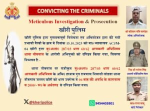 उत्तर प्रदेश शासन की मंशा के अनुरूप जनपद लखीमपुर खीरी पुलिस द्वारा “ऑपरेशन कन्विक्शन” के तहत अपराधियों के विरुद्ध लगातार प्रभावी कार्रवाई और मुकदमों की सशक्त पैरवी की जा रही है। इसी क्रम में एक मामले में आज माननीय न्यायालय जनपद खीरी द्वारा अभियुक्त को सजा सुनाई गई है।