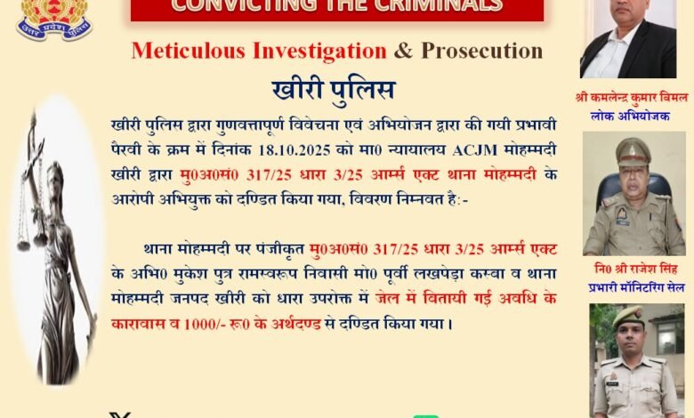 अभि0 मुकेश पुत्र रामस्वरूप, निवासी मो0 पूर्वी लखपेड़ा, थाना मोहम्मदी जनपद खीरी के कब्जे से अवैध शस्त्र बरामद होने पर (मु0अ0सं0 317/25, धारा 3/25 आर्म्स एक्ट) मुकदमा दर्ज था। ACJM मोहम्मदी, खीरी द्वारा विचारण के बाद मुकेश को जेल में बिताई गई अवधि के बराबर कारावास और 1,000/- रुपये के अर्थदंड की सजा सुनाई गई। इस मामले में लोक अभियोजक श्री कमलेन्द्र कुमार विमल और न्याय पैरोकारी का0 अटल वीर का योगदान रहा।
