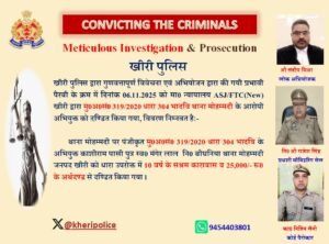 उत्तर प्रदेश शासन की मंशा के अनुरूप अपराधियों के विरुद्ध प्रभावी पैरवी और कठोर कार्रवाई के तहत लखीमपुर खीरी पुलिस द्वारा ऑपरेशन कन्विक्शन अभियान के अंतर्गत बड़ी सफलता प्राप्त की गई है। पुलिस की सशक्त पैरवी के चलते जनपद की विभिन्न अदालतों ने कुल पाँच मामलों में आरोपियों को सजा सुनाई है।