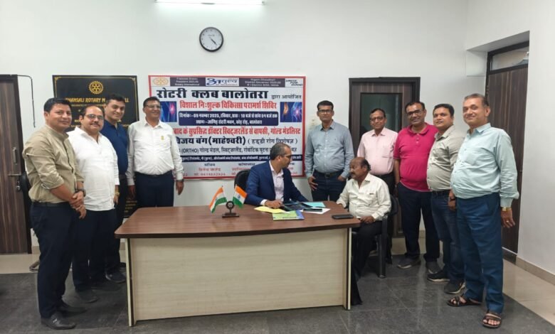 बालोतरा। रोटरी क्लब बालोतरा द्वारा जांगिड़ रोटरी भवन में विशाल निःशुल्क चिकित्सा एवं परामर्श शिविर का आयोजन किया गया, जिसमें सुप्रसिद्ध हड्डी रोग विशेषज्ञ डॉ. विजय बंग (माहेश्वरी) ने कुल 93 मरीजों की जांच कर उन्हें निःशुल्क परामर्श प्रदान किया।