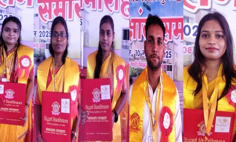 बस्ती। सोमवार को सिद्धार्थ विश्वविद्याल कपिलवस्तु सिद्धार्थनगर के नवम दीक्षांत समारोह में राज्यपाल आनंदीबेन पटेल द्वारा चौधरी चरण सिंह महाविद्यालय पदमापुर की बीएससी एजी की छात्रा हर्षित यादव , एमएससी एजी एग्रोनॉमी के छात्र आकाश यादव , एमएससी एजी हॉर्टिकल्चर की छात्रा काजल चौधरी, एमएससी एजी कृषि प्रसार की छात्रा सृजना चौधरी तथा एमए भूगोल की छात्रा किरण को विश्वविद्यालय में अपने विषयों में सर्वोच्च अंक प्राप्त करने पर गोल्ड मेडल प्रदान कियागया।