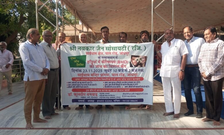 श्रीनवकार जैन सोसाइटी के तत्वावधान में आयोजित होने वाले निशुल्क स्वास्थ्य जांच शिविर का बैनर आज पाल रोड स्थित साईं धाम प्रांगण में विधिवत रूप से विमोचन किया गया। इस अवसर पर सोसाइटी अध्यक्ष गोपाल भंडारी, गौतम सिंघवी, महेंद्र मेहता, धनराज विनायकिया, महेंद्र गांधी, नरपत मेहता, जितेंद्र वेद मेहता, संदीप बालड, मुकेश जैन सहित कई सदस्यों ने “जैनम् जयति शासनम्” के जयघोष के साथ बैनर का लोकार्पण किया।