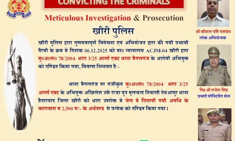 अवैध शस्त्र व कारतूस बरामद होने के मामले में माननीय ACJM-4 खीरी ने आरोपी को जेल में बिताई गई अवधि को कारावास मानते हुए तथा ₹2,500 अर्थदण्ड की सजा सुनाई।