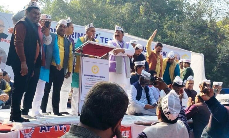 बस्ती। गुरूवार को अखिल भारतीय प्राथमिक शिक्षक संघ के आवाहन पर राजधानी दिल्ली के जन्तर मन्तर पर टेट अनिवार्यता को वापस लिए जाने, पुरानी पेंशन बहाल करने सहित 8 सूत्रीय मांगों को लेकर विशाल धरना सांकेतिक रूप से हुआ। धरना को संबोधित करते हुए उत्तर प्रदेशीय प्राथमिक शिक्षक संघ बस्ती के जिला अध्यक्ष उदय शंकर शुक्ल ने सम्बाधित करते हुये कहा कि एकजुटता से ही सफलता मिलती है । राष्ट्रीय अध्यक्ष सुशील कुमार पाण्डेय के आवाहन पर जिस प्रकार से टेट अनिवार्यता वापस लिये जाने की मांग को लेकर संघर्ष चल रहा है निश्चित रूप से सरकार को आगे आकर शिक्षकों की समस्याओं का समाधान कराना ही होगा। धरने में निर्णय लिया गया कि यदि मांगों पर शीघ्र सम्यक निर्णय नहीं लिया गया तो फरवरी माह में व्यापक आंदोलन दिल्ली के धरती पर होगा।