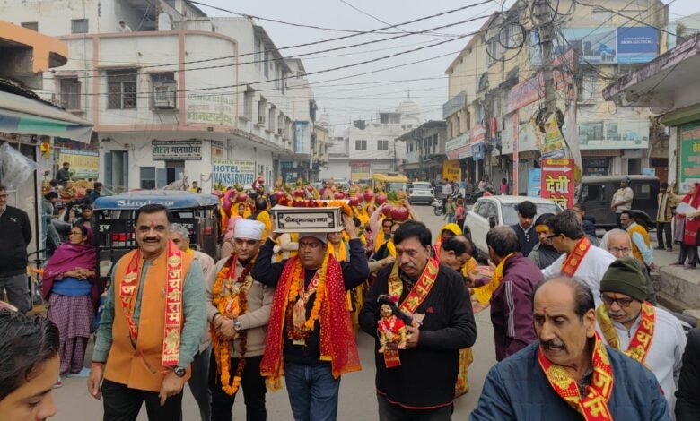 भारत रत्न पंडित मदन मोहन मालवीय जी की जन्म जयंती के पावन अवसर पर रुद्रपुर के पांच मंदिर परिसर में आयोजित होने जा रही श्रीमद्भागवत कथा के शुभारंभ से पूर्व निकाली गई भव्य कलश यात्रा