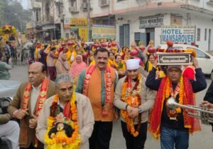 A grand procession carrying sacred water pots was taken out before the commencement of the Shrimad Bhagwat Katha, which is being organized at the five temple complex in Rudrapur on the auspicious occasion of the birth anniversary of Bharat Ratna Pandit Madan Mohan Malaviya.