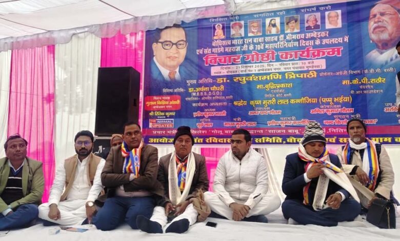 बस्ती। भारत रत्न संविधान निर्माता बाबा साहब और महान संत गाडगे के परिनिर्वाण दिवस के उपलक्ष्य में रविवार को नगर पंचायत मुण्डेरवा के अम्बेडकर नगर बोदवल में संत रविदास सेवा समिति अध्यक्ष प्रदीप कुमार भारती, वेदमणि, अमर चन्द्र, अनिल कुमार, सूर्यलाल, माधव मुरारी, प्रवीन कुमार कन्नौजिया, नन्द किशोर नन्दू और अरविन्द के संयोजन में संगोष्ठी का आयोजन किया गया।