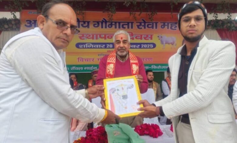 अंतरराष्ट्रीय गौमाता सेवा महासंघ के स्थापना दिवस के अवसर पर रायल गार्डन, टूंडला (फिरोजाबाद) में एक भव्य कार्यक्रम का आयोजन किया गया। इस कार्यक्रम में नगर की उत्कृष्ट स्केच आर्टिस्ट प्रतिभा एवं छात्र मोक्ष अमर टैगोर, पुत्र सुनील अमर टैगोर (संचालक – मोक्ष टैगोर आर्ट वर्क) ने अपने हस्त से निर्मित गौमाता के स्वरूप की सुंदर शिल्पकला तैयार कर महासंघ के राष्ट्रीय अध्यक्ष डॉ. दिनेश उपाध्याय जी को सादर भेंट की।