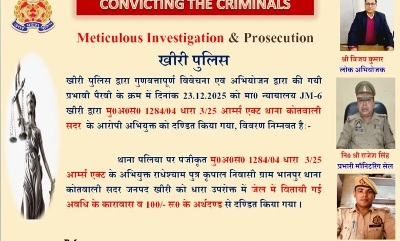 उत्तर प्रदेश शासन की मंशा के अनुरूप जनपद लखीमपुर खीरी पुलिस द्वारा ऑपरेशन कन्विक्शन अभियान के अंतर्गत अपराधियों के विरुद्ध प्रभावी कार्रवाई एवं सशक्त पैरवी जारी है। इसी क्रम में एक पुराने आपराधिक मामले में माननीय न्यायालय द्वारा अभियुक्त को दंडित किया गया है।