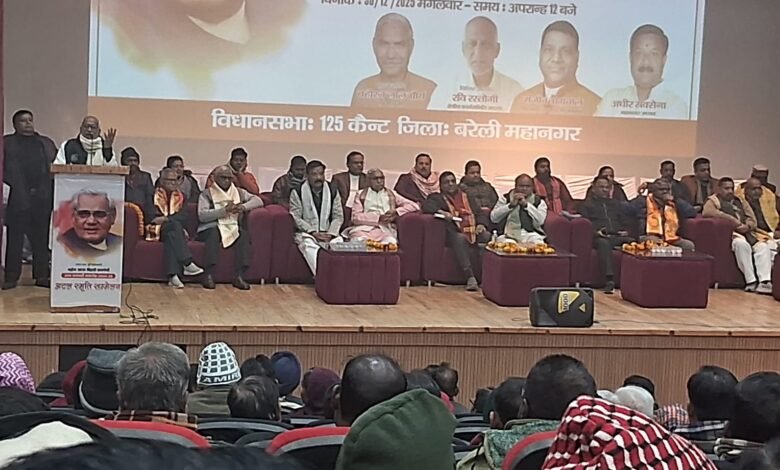 बरेली…भारत रत्न भारत रत्न पूर्व प्रधानमंत्री स्वर्गीय अटल बिहारी वाजपेई जी की जन्म शताब्दी समारोह पर आज बरेली महानगर (नगर निगम) मे “अटल स्मृति समारोह” का आयोजन अर्बन हार्ट ऑडिटोरियम मे महानगर अध्यक्ष अधीर सक्सेना जी की अध्यक्षता में आयोजित हुआ। कार्यक्रम के मुख्यतिथि सिंचाई एवं जल संसाधन मंत्री स्वतंत्र देव सिंह व विशिष्ट क्षेत्रीय अध्यक्षदुर्विजय सिंह शाक्य द्वारा अटल जी के चित्र पर माल्यार्पण व पुष्पांजलि कर किया गया। कार्यक्रम का संचालक महानगर उपाध्यक्ष विष्णु शर्मा द्वारा किया गया।