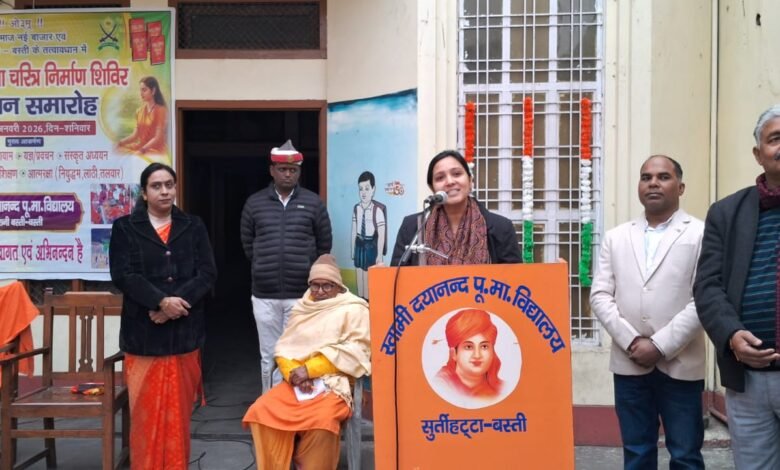 आर्य समाज और आर्य वीर दल बस्ती द्वारा स्वामी दयानन्द पूर्व माध्यमिक विद्यालय सुरतीहट्टा में आयोजित चरित्र निर्माण शिविर के समापन के अवसर पर आर्य वीरांगनाओं द्वारा प्रशिक्षिकाओं राधा आर्य और शालू आर्य के सानिध्य में आत्मरक्षार्थ लाठी, जूडो कराटे, त्रिदेश मुष्टि प्रहार, अर्द्धमुष्टि प्रहार, हस्ततल प्रहार आदि का प्रदर्शन कर लोगों को वीर नारियों का दर्शन कराया। योगासनों एवं व्यायामों के माध्यम से बच्चों ने विभिन्न प्रकार के स्तूप, मानव पुल एवं हिमालय सहित दर्जन भर दृश्यों का प्रदर्शन किया। शिविर में दृष्टि मोदनवाल, अर्पिता और भव्या यादव को क्रमशः प्रथम द्वितीय और तृतीय स्थान प्राप्त किया। वहीं आराध्या गुप्ता को विशिष्ट स्थान प्राप्त किया। शिविर इस अवसर पर मुख्य अतिथि के रूप में सम्मिलित जिलाधिकारी कृत्तिका ज्योत्सना ने कहा कि इस प्रशिक्षण से प्राप्त शारीरिक, मानसिक और आत्मिक ऊर्जा को अपनी उन्नति के लगाकर बेटियां राष्ट्र के लिए अपना सर्वोत्तम प्रदान करेंगी ऐसा मुझे विश्वास है। आर्य वीरांगना दल निश्चित रूप से ऐसी ही पौध तैयार कर रहा है। आर्य वीर दल शस्त्र का प्रयोग शास्त्र के अनुसार ही करता है इसके माध्यम से हमारे देश का युवा अपने राष्ट्र को निरन्तर रक्षित करता रहता है। विशिष्ट अतिथि डॉ रीना पाठक प्राचार्या शिवर्ष किसान पीजी कॉलेज बस्ती ने कहा कि क्रान्ति केवल देश की सुरक्षा के लिए ही नहीं होती बल्कि विचारों की सुरक्षा के लिए भी करनी होती है जो एक संस्कारित युवा शक्ति ही कर सकती है। बालिकाएं राष्ट्र की अमूल्य निधि होती हैं इनका संरक्षण माता पिता और आचार्य के माध्यम से होता है। उत्तम संस्कारवान माता-पिता ही अपने बच्चों को सक्षम गुरू के हाथों में सौंप पाते है जिससे उनका अतुलनीय निर्माण हो पाता है। इससे पूर्व अतिथियों को प्रशिक्षिका राधा और शालू आर्य द्वारा परेड निरीक्षण कराया गया तथा मार्च पास करते हुए आर्य वीरांगनाओं को सलामी दी गयी। अन्य प्रमुख अतिथियों का तिलक और ओम पट्टिका से सम्मान किया गया। कार्यक्रम का प्रारम्भ ईश वन्दना और दीप प्रज्वलन से किया गया। इसके पश्चात प्रशिक्षिकाओं के नेतृत्व में आर्य वीरांगनओं द्वारा प्रस्तुत संगीतमय सर्वांग सुन्दर व्यायाम, सूर्य नमस्कार, भूमि नमस्कार देखकर उपस्थित अभिभावक एवं अन्य गणमान्य गदगद हो रहे थे वहीं युवा नई चेतना प्राप्त कर रहे थे। कार्यक्रम का संचालन करते हुए आदित्य नारायण गिरि ने कहा कि आज घर-घर में आर्य वीरों की आवश्यकता है। ओम प्रकाश आर्य ने कहा कि आर्य वीर अपने देश के साथ कभी धोखा नहीं कर सकता समाज के साथ गद्दारी नहीं कर सकता। इतिहास साक्षी है कि जब-जब राष्ट्र पर कोई संकट आया है तब-तब आर्य वीरों ने अपने