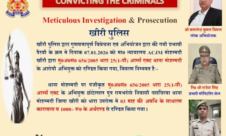 उत्तर प्रदेश शासन की मंशा के अनुरूप जनपद लखीमपुर खीरी पुलिस द्वारा ऑपरेशन कन्विक्शन के तहत अपराधियों के विरुद्ध प्रभावी कार्यवाही की जा रही है। इसी क्रम में 03 मामलों में माननीय न्यायालय जनपद खीरी द्वारा आरोपी को दण्डित किया गया है।