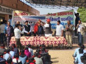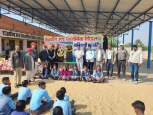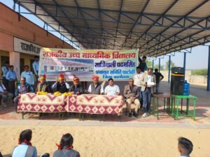 सांसद उम्मेदाराम बेनिवाल‌ द्वारा भामाशाह हेमन्त चौधरी निदेशक आधार क्लासेज एवं सिविल इंजीनियर महेन्द्र रमण का साफा बंधाकर बहुमान किया गया। एवं अपने उद्‌बोधन में कहा कि विद्यार्थी जीवन में शिक्षा ग्रहण कर उच्च पद पर पहुंचे तथा जीवन में हमेशा ऊँचे सपने रखें। छात्रों को डिजिटल शिक्षा की जानकारी देवें तथा सांसद कोटे से विद्यालय को एक स्मार्ट बोर्ड उपलब्ध कराने के साथ-साथ C.S.R. मद से विद्यालय विकास में योगदान करने का विश्वास दिलाया।