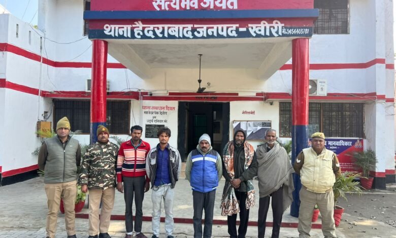पुलिस अधीक्षक खीरी, श्री संकल्प शर्मा द्वारा जनपद खीरी में अपराध एवं अपराधियों के विरुद्ध चलाये जा रहे अभियान के अंतर्गत अपर पुलिस अधीक्षक खीरी के निकट पर्यवेक्षण में व क्षेत्राधिकारी गोला के कुशल मार्गदर्शन एवं थानाध्यक्ष हैदराबाद के नेतृत्व में आज दिनांक 11.12.2025 को थाना हैदराबाद पुलिस द्वारा , 06 नफर वारंटी अभियक्तों 1.सुबोध कुमार पुत्र धर्मेश निवासी ग्राम कोरैया एजेन्ट थाना हैदराबाद खीरी 2.जसपाल पुत्र रामसेवक निवासी ग्राम गजियापुर थाना हैदराबाद जनपद खीरी 3. छत्रपाल पुत्र नरपत निवासी ग्राम कैमहरा थाना हैदराबाद जनपद खीरी 4.मनोहरलाल पुत्र नरपत निवासी ग्राम कैमहरा थाना हैदराबाद खीरी 5.किशन पुत्र भारत प्रसाद निवासी ग्राम छिछौना थाना हैदराबाद जनपद खीरी 6.राजीव कुमार पुत्र चन्द्रभाल निवासी ग्राम सुहेला थाना हैदराबाद खीरी को गिरफ्तार किया गया । विधिक कार्यवाही पूर्ण कर माननीय न्यायालय भेजा गया ।