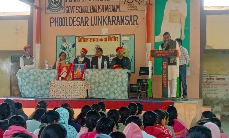 लूणकरणसर 12 जनवरी। राजकीय महात्मा गांधी इंग्लिश मीडियम स्कूल माध्यमिक विद्यालय फुलदेसर,राजकीय बालिका उच्च माध्यमिक विद्यालय उड़ाना एवं तालुका विधिक सेवा समिति के संयुक्त तत्वाधान में राष्ट्रीय युवा दिवस के उपलक्ष्य में राजस्थान राज्य विधिक सेवा प्राधिकरण जयपुर एवं सचिव जिला विधिक सेवा प्राधिकरण, बीकानेर के निर्देशानुसार तालुका विधिक सेवा समिति के पैनल सदस्य श्रेयांश बैद द्वारा विधिक जागरूकता शिविर आयोजित किया गया ।