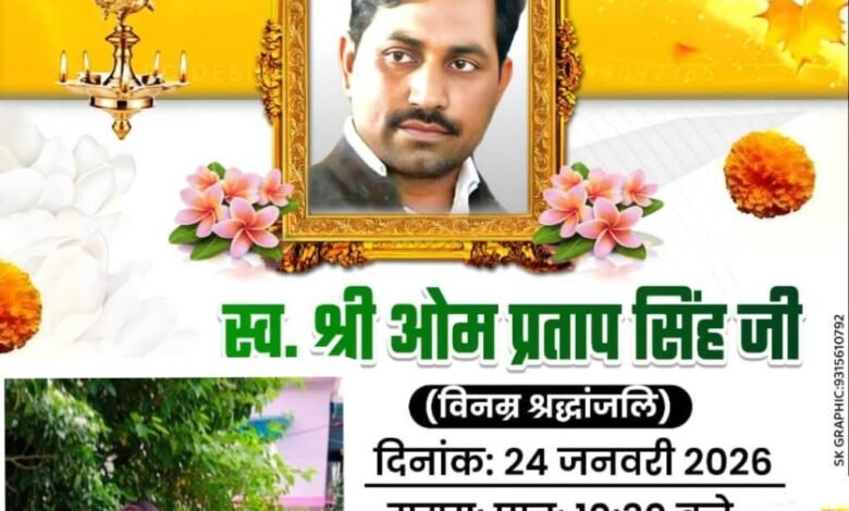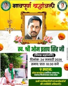 भारतीय किसान यूनियन (भानु) के राष्ट्रीय मीडिया प्रभारी लक्ष्य अमर ठाकुर की सूचना के अनुसार, दिनांक 24 जनवरी 2026, शनिवार को प्रातः 10 बजे प्रदेश कार्यालय इमलिया उममरगढ़, जनपद फिरोजाबाद में एक श्रद्धांजलि सभा का आयोजन किया जाएगा।