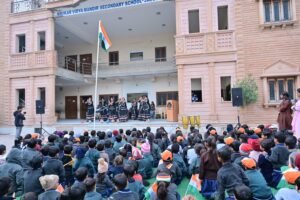 जसोल- स्थानीय नवकार विद्या मंदिर माध्यमिक जसोल में 77 वां गणतंत्र दिवस समारोह हर्षोल्लास के साथ मनाया गया। प्रधानाचार्या किरण कोठारी ने बताया कि विद्यालय में आयोजित कार्यक्रम में नवकार शिक्षण समिति अध्यक्ष उषभराज जी तातेड़, श्री ओसवाल समाज जसोल अध्यक्ष अशोक कुमार जी ढ़ेलडिया, तेरापंथ सभा अध्यक्ष भूपतराज जी कोठारी , नवकार शिक्षण समिति सचिव महेंद्र जी भुतानी एवं पूर्व अध्यक्ष डूंगर चंद जी सालेचा, अशोक पी. चौपड़ा, विजेन्द्र मेहता , देवराज जे बोकड़िया, देवराज सी बोकड़िया ने ध्वजारोहण किया । इसके पश्चात विद्यालय के छात्र-छात्राओं द्वारा देशभक्ति व लोक संस्कृति से ओतप्रोत , नृत्य , गीत, व भाषण की प्रस्तुति दी गई।इस अवसर पर विद्यालय विकास हेतु मातुश्री स्व. सुकी देवी धर्मपत्नी स्व. चम्पालाल जी ढ़ेलडिया बोहरा की प्रथम पुण्य स्मृति में 21000 हजार रुपये उनके सुपुत्र अशोक जी ढ़ेलडिया (मोनिका ग्रुप) द्वारा देने की घोषणा की गई।