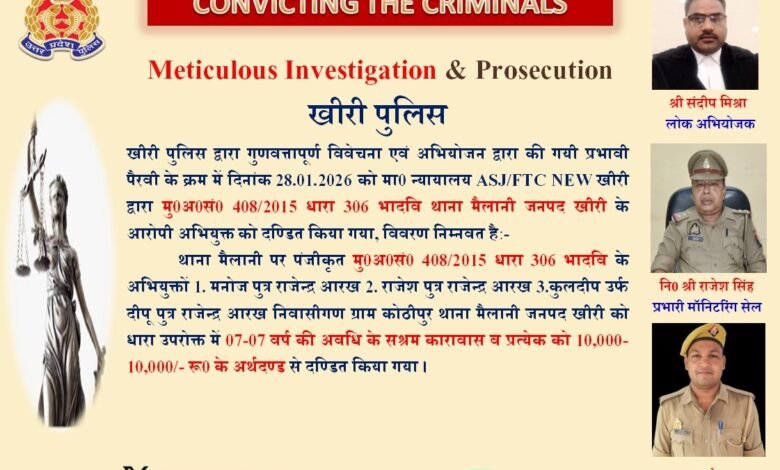 उत्तर प्रदेश शासन की मंशा के अनुरूप जनपद लखीमपुर खीरी पुलिस द्वारा ऑपरेशन कन्विक्शन के तहत अपराधियों के विरुद्ध प्रभावी पैरवी के परिणामस्वरूप एक पुराने मामले में न्यायालय द्वारा दोषियों को सजा सुनाई गई है।