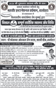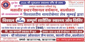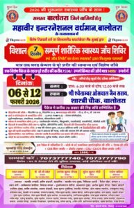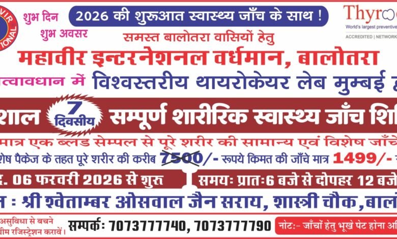 महावीर इंटरनेशनल वर्धमान बालोतरा के तत्वावधान में विश्वस्तरीय थायरोकेयर लैबोरेटरी, मुंबई द्वारा बालोतरा में एक विशेष मेगा हेल्थ चेक-अप शिविर का आयोजन किया जा रहा है। यह शिविर 06 फरवरी से 12 फरवरी 2026 तक शास्त्री चौक स्थित जैन सराय में आयोजित होगा।