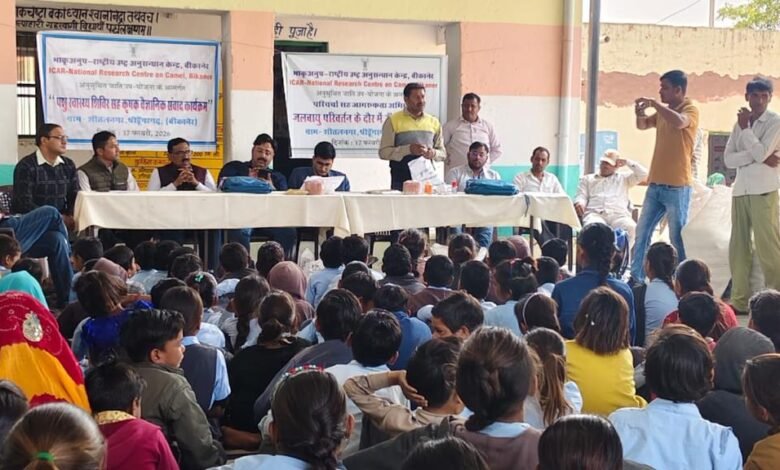 बीकानेर, 17 फरवरी 2026 । भाकृअनुप-राष्ट्रीय उष्ट्र अनुसंधान केंद्र (एनआरसीसी), बीकानेर द्वारा आज श्रीडूंगरगढ़ (बीकानेर) के ग्राम शीतलनगर, में ‘अनुसूचित जाति उप-योजना’ (एस.सी.एस.पी.) के तहत एक दिवसीय पशु स्वास्थ्य शिविर एवं कृषक-वैज्ञानिक संवाद कार्यक्रम, राजकीय उच्च प्राथमिक विद्यालय, शीतलनगर में आयोजित किया गया। शिविर में 96 से अधिक महिला व पुरुष पशुपालकों को लाभान्वित किया गया। साथ ही 72 स्‍कूली विद्यार्थियों में उष्‍ट्र प्रजाति के प्रति जागरूकता बढ़ाने हेतु ‘जलवायु परिवर्तन के दौर में ऊँट की भूमिका’ विषयक परिचर्चा भी आयोजित की गई।